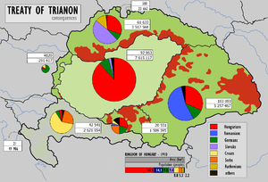 Picture - Difference between the borders of the Kingdom of Hungary within Austria-Hungary and independent Hungary after the Treaty of Trianon. Based on the 1910 census. Administrative Hungary in green, autonomous Croatia-Slavonia grey.