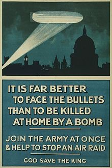 Picture - British WWI poster of a Zeppelin above London at nighttime, with the text "It is far better to face the bullets than to be killed at home by a bomb. Join the army at once & help to stop an air raid. God save the King".