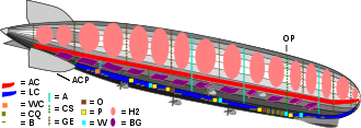 Picture - The pink ovals depict hydrogen cells inside the LZ 127, the magenta elements are Blaugas cells. The full-resolution picture labels more internals.